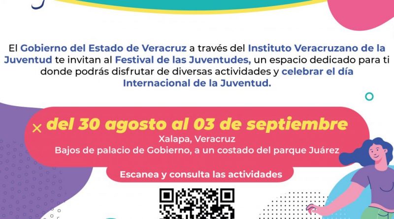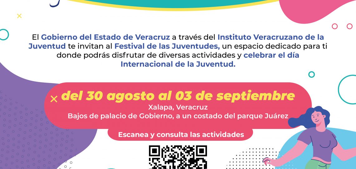 #GobiernoDeVeracruz.- El Instituto Veracruzano de la Juventud invita al Festival de la Juventudes, del 30 de agosto al 03 de septiembre, enfocado en aumentar los mecanismos de participación e inclusión mediante espacios de expresión cultural y artística.