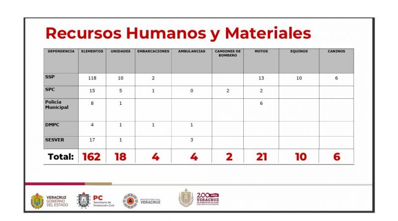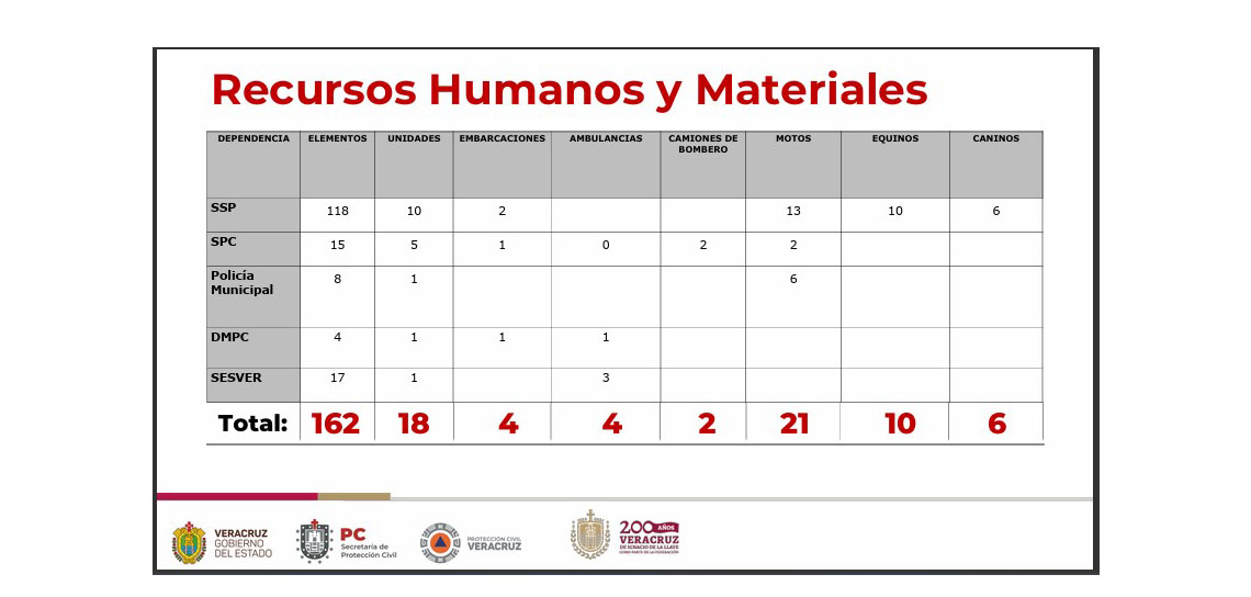 Con la instalación de un puesto de mando unificado, el despliegue de prevención y resguardo ciudadano dispone de 45 unidades terrestres (patrullas, ambulancias, camiones de bomberos y motocicletas), dos embarcaciones y el apoyo de equinos y binomios caninos de Fuerza Civil.